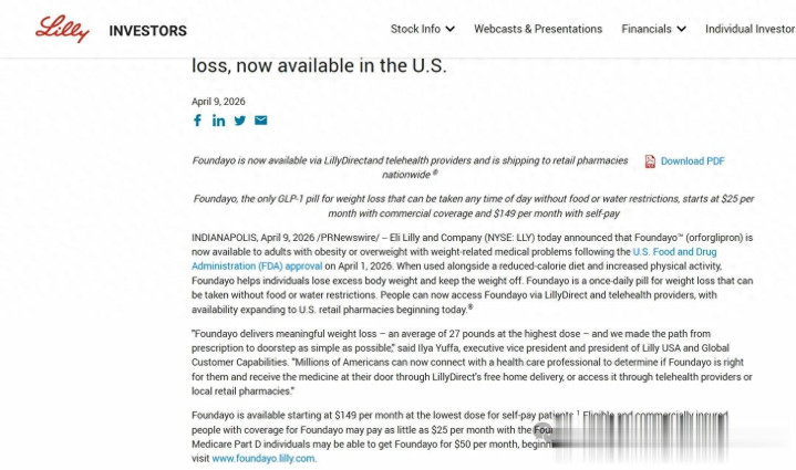 当地时间4月9日,礼来宣布,其口服减重药Foundayo™(orforglipron)正式在直售平台LillyDirect及各大远程医疗平台上线,并从当日起扩展至美国零售药房。
